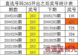 从上表统计可以看出,直选号码263开出之后,其下期奖号: