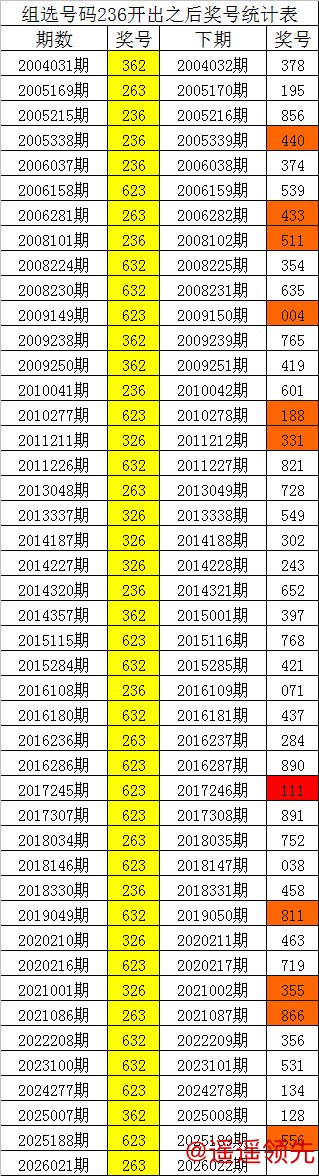 体彩排列三组选号码236历史上出现了45次,其下期奖号分别为:378、195、856、440、374、539、433、511、354、635、004、765、419、601、188、331、821、728、549、302、243、652、397、768、421、071、437、284、890、111、891、752、038、458、811、463、719、355、866、356、531、134、128、556,详细统计见下表: