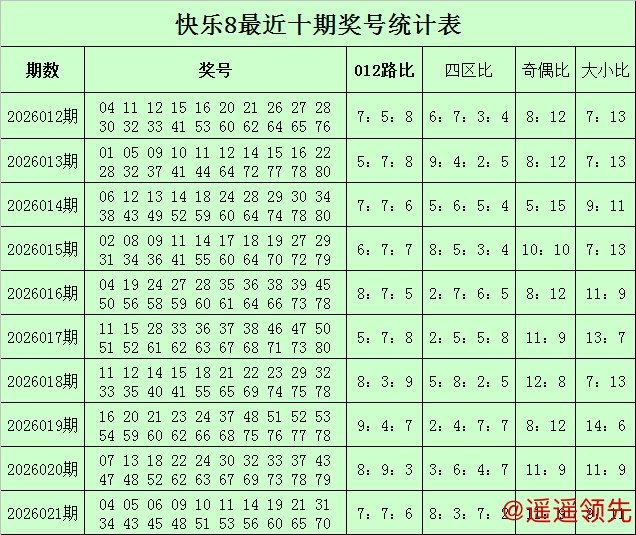 福彩快乐8第2026021期开奖回顾:04 05 06 09 10 11 14 19 21 31 34 43 45 48 51 53 56 60 65 70,其中奖号012路比为7:7:6,四区比为8:3:7:2,奇偶比为11:9,大小比为9:11。