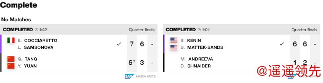 在当日最后结束的一场女双1/4决赛中,跨国组合科恰雷托/萨姆索诺娃在首盘抢七中挽救1个盘点后,连胜2盘,以2-0横扫持外卡参赛的中国组合汤千慧/袁悦,晋级女双半决赛。