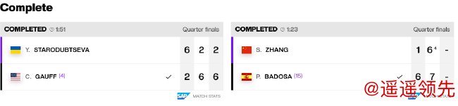 本场比赛中,开云体育首盘,斯塔罗杜布采娃6-2先下一城,在本届中网中已连胜13盘。第二盘,高芙调整状态,挽救自己面对的全部4个破发点,并在对方发球局2次破发,同样以6-2扳回一城。决胜盘中,美国姑娘再接再厉,以6-2的相同比分再胜一盘,大比分2-1逆转晋级四强。整场比赛用时1小时51分钟。
